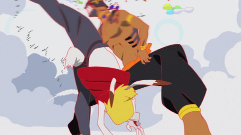 Fighting can be done on any device—computer, hand-held game, cellphone, etc.—and is shown as a series of button commands that translates into the character moving. It is not quite clear how such differing ways of coding translate to doing so much in the virtual world. There are fighting scenes between King Kazma and Love Machine that establish them as solid beings. They fight like humans with strong and solid bones.